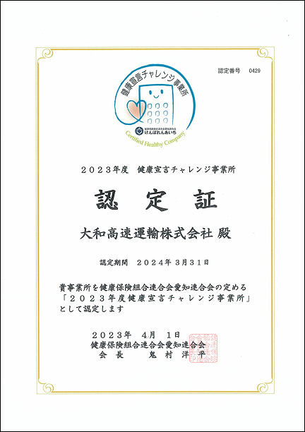 2023年度 健康宣言チャレンジ事業所認定証